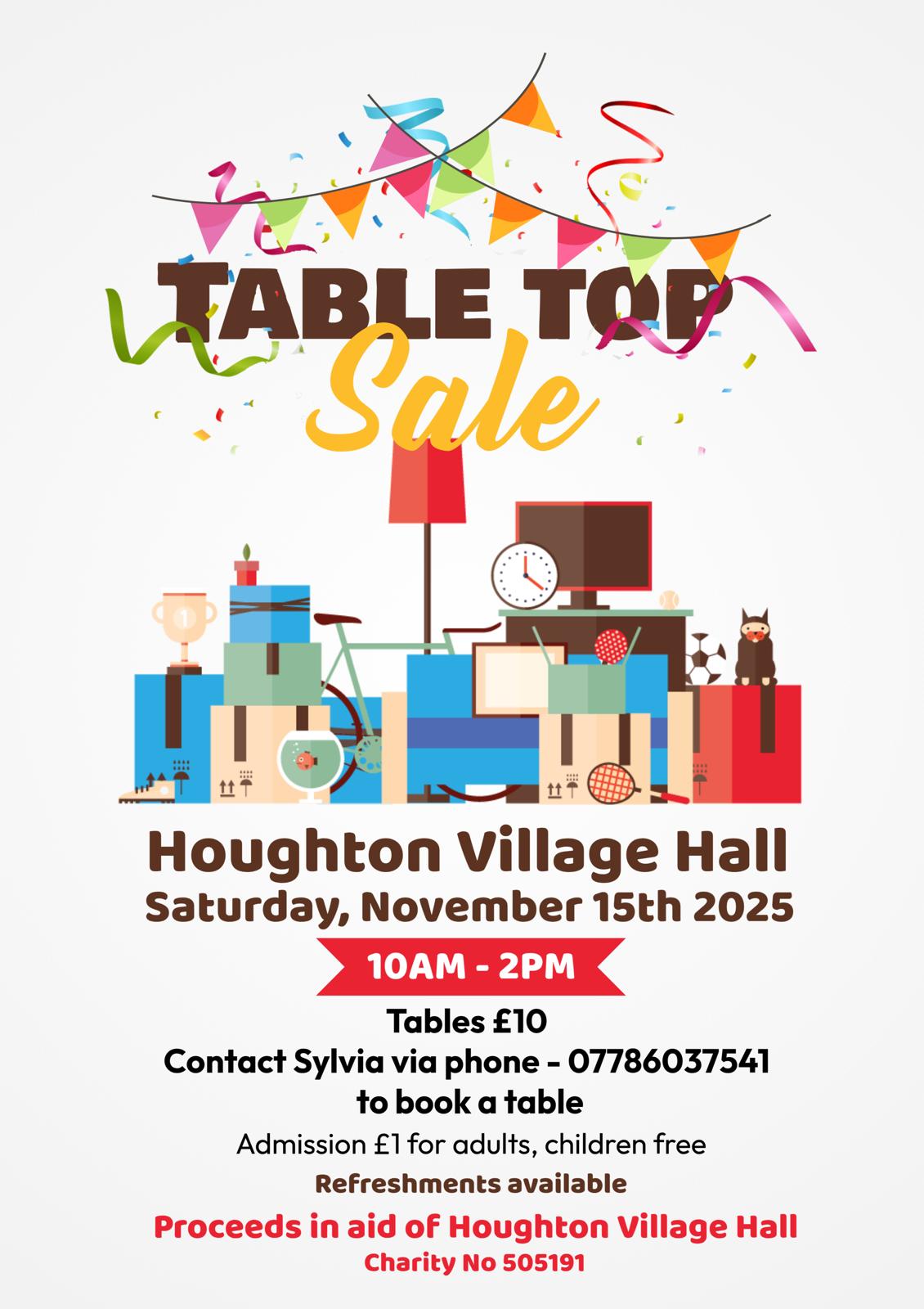 Join us at the Village Hall for our Table Top Sale. We have 30 stalls with bargains and some unique finds. Whether you're hunting for a hidden gem or just browsing, there’s something for everyone!